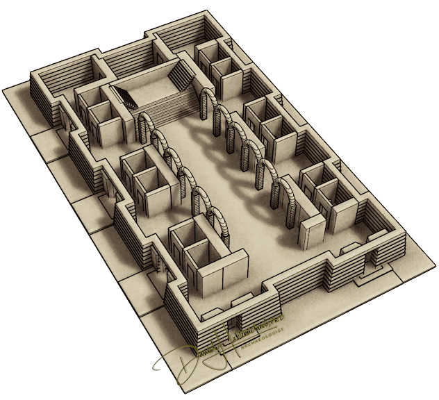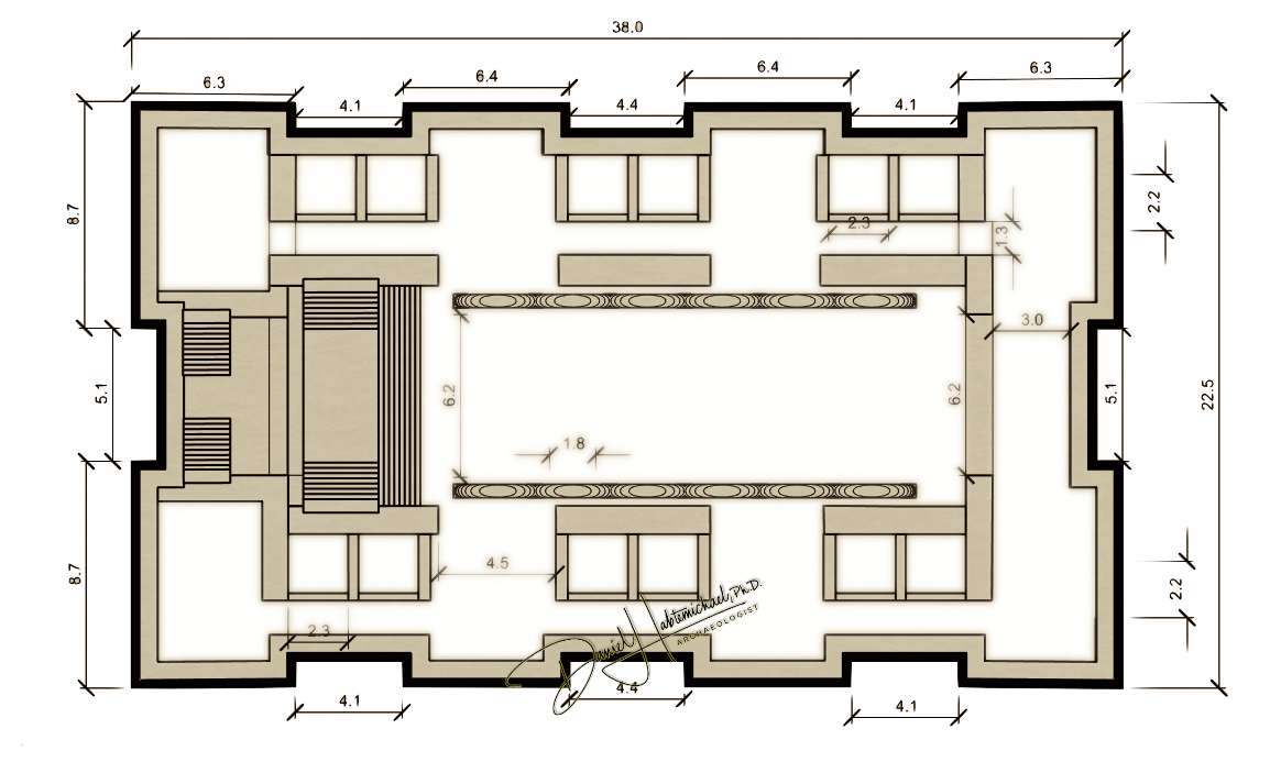 ሕንጻ ባይቶ ኣዱላውያን፡ ኣብ ማእከል እቲ ኣዳራሽ፡ ሾብዓተ አዕኑድ ብየማንን ብጸጋምን ሰሪዑ፡ ኣብ ላዕለዋይ ጥርዙ ብፍርቂ ክቢ ምልኩዕ ዓንዲ፡ ካብ ሓደ ዓንዲ ናብቲ ካልእ ዓንዲ ይተኣሳሰር (ኣብ ታሕቲ ዘሎ ሰእሊ ተመልከቱ)። የማናይ ወገን መስርዕ አዕኑድ ካብቲ ጸጋማይ ወገን መስርዕ ብ6.2 ሜትሮ ይረሓሓቕ። እዚ በአዕኑድ ዘጌጸ ማእከል ኣዳራሽ ሕንጻ ባይቶ 26 ሜትሮ ንውሒ፡ 8.4 ሜትሮ ግፍሒ ኣለዎ። ብየማንን ብጸጋምን እዚ ማእከላይ ኣዳራሽ፡ ሸሽዱሽተ ንኣሽቱ ገዛውቲ ኣለውዎ (ኣብ ታሕቲ ዘሎ ሰእሊ ተመልከቱ)። ናብ ኣዳራሽ ባይቶ ኣዱላውያን ብሓሙሽተ መእተዊታት ይእቶ።ብወገን ደቡብ ሰለስተ 4.1 ሜትሮ ዝምግፍሖም መዓጹ እንክህልውዎ ብወገን ምብራቕ ግን ክልተ 2.2 ሜትሮ ዝግፍሖም መዓጹ ኣለውዎ። ኣብ 3.5 ሜትሮ ንላዕሊ፡ ቀዳማይ ደርቢ በዕኑድ ጽሕድን ኣውሊዕን ተረቢቡ ይዛዘም (ኣብ ታሕቲ ዘሎ ሰእሊ ተመልከቱ)።