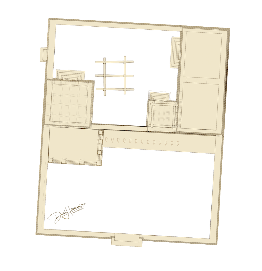 Adulis Burial (Building14) is a large rectangle, 38.52 m by 30.52, divided into two by a central wall. The northern part has rectangular structures, 4 of them on the living floor and base floor. However, rather than being used as living space, the southern part as some sort of grave or ceremonial site or shrine.