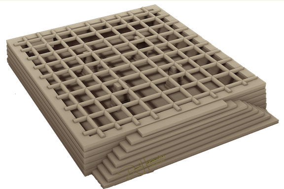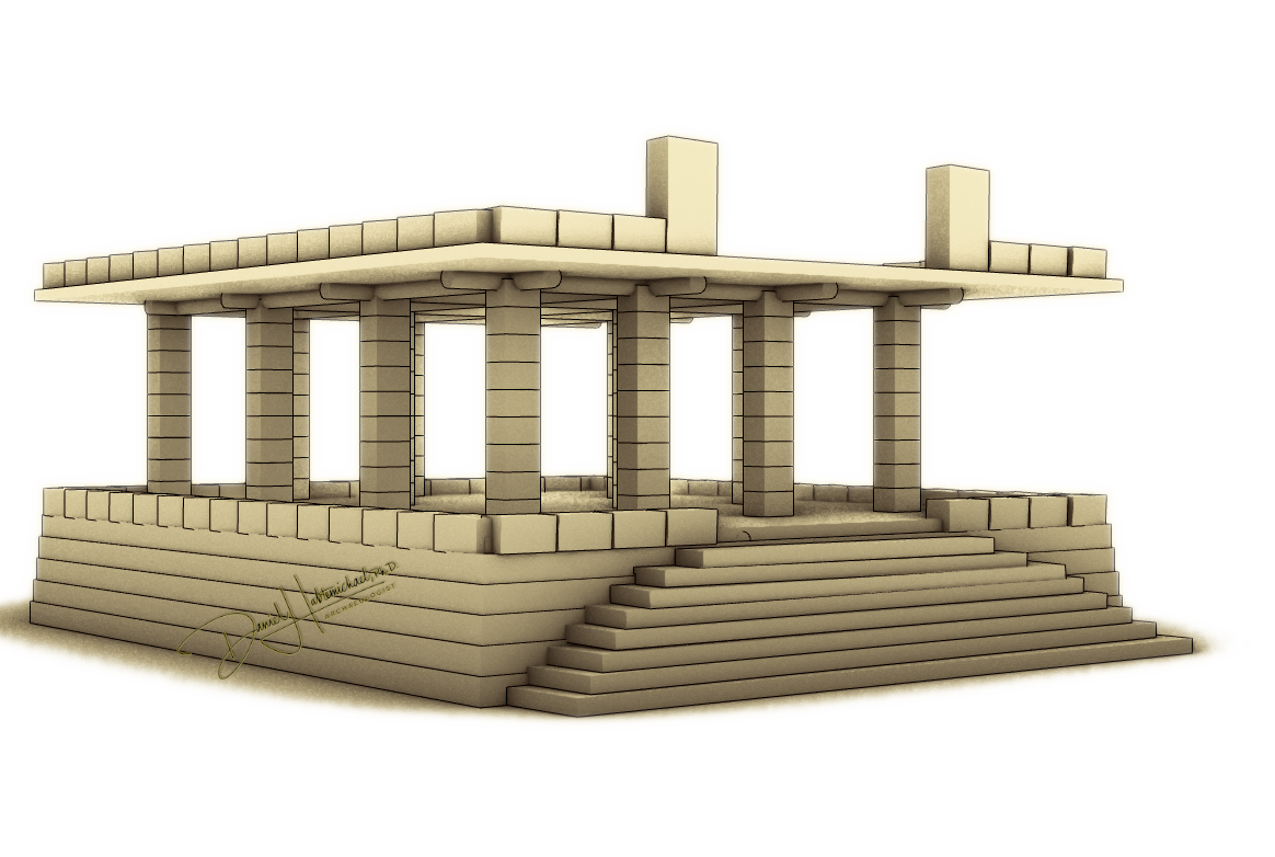 The base walls are constructed up to 2.5 m. Beams supported by four walls and the four columns on the base floor spread the weight of the living floor. The base floor has a large door on the southern wall, a door 2.79 m wide and 2 m high, suggesting storage functionality with transport animals with loads readily accessible (see the last two pictures). On the Northern wall, eight stair slabs rise to the living floor each subsequent slab with slightly reduced size than the previous one (see the first picture). The living floor has a retaining wall of rectangular cut stone surrounding the edges. Then the 16 columns of rectangular stones populate the living floor. The beams that tie these columns on the top end complete the building, such that it has a roof with retaining stones (see picture below).